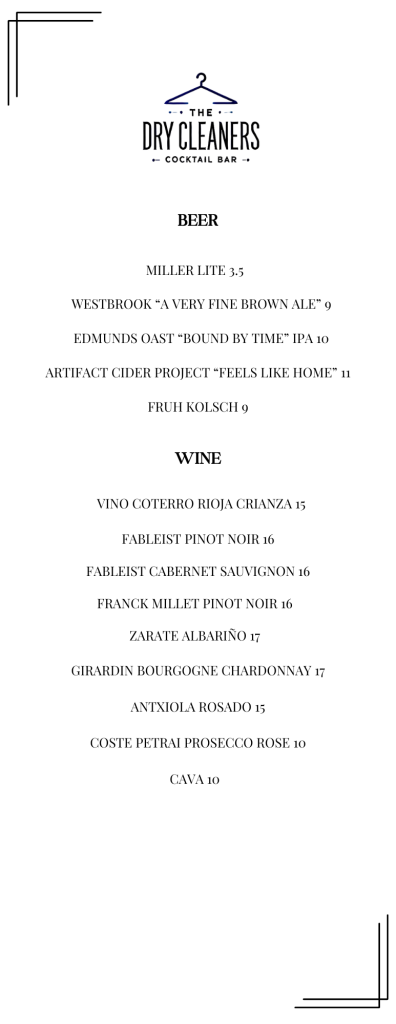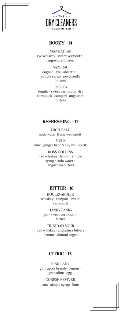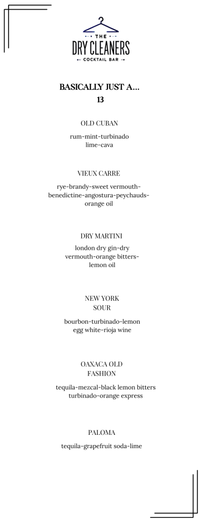 Our bartenders craft each drink with precision — balancing flavor, texture, and presentation. Expect familiar favorites reimagined with a twist and signature cocktails exclusive to The Dry Cleaners.